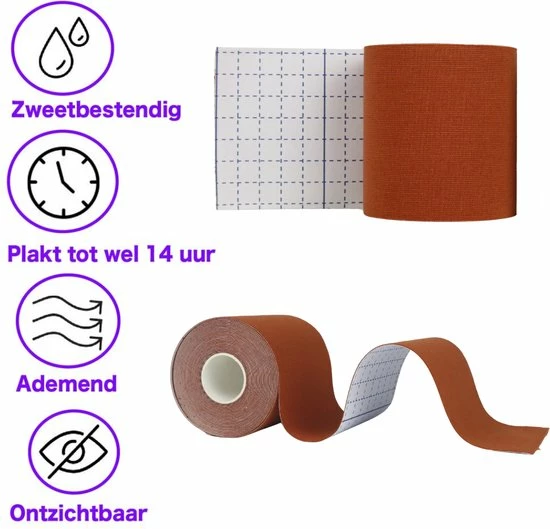 De booptape is 7,5 cm breed en maar liefst 5 meter lang! Hierdoor heb jij voldoende booptape om te experimenteren welke manier het beste bij jou past. De ConfiDannce booptape is van medische kwaliteit, bevat geen schadelijke stoffen en is ademend. Tevens is de booptape hypoallergeen en daarmee ook vrij van latex.