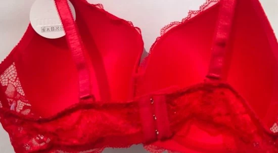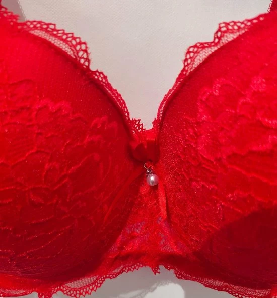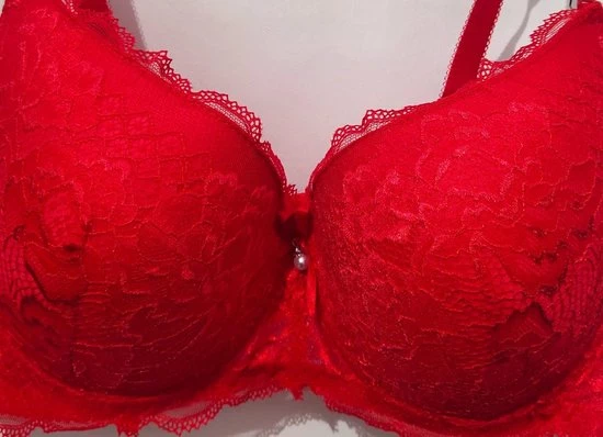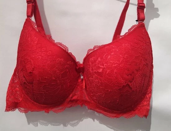 Een mooie bh 90E rood met kant, confectiemaat 44-46. Deze bh heeft voorgevormde cup met beugel voor optimale ondersteuning. De afneembaar schouderbandjes zijn verstelbaar en heeft 3 haakjes sluiting. Het materiaal is van 80% polyamide 10% polyester 10% elastaan.
