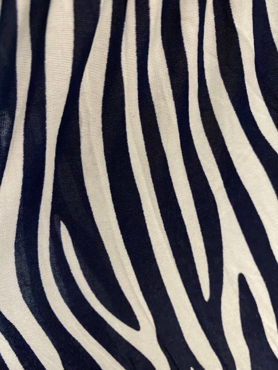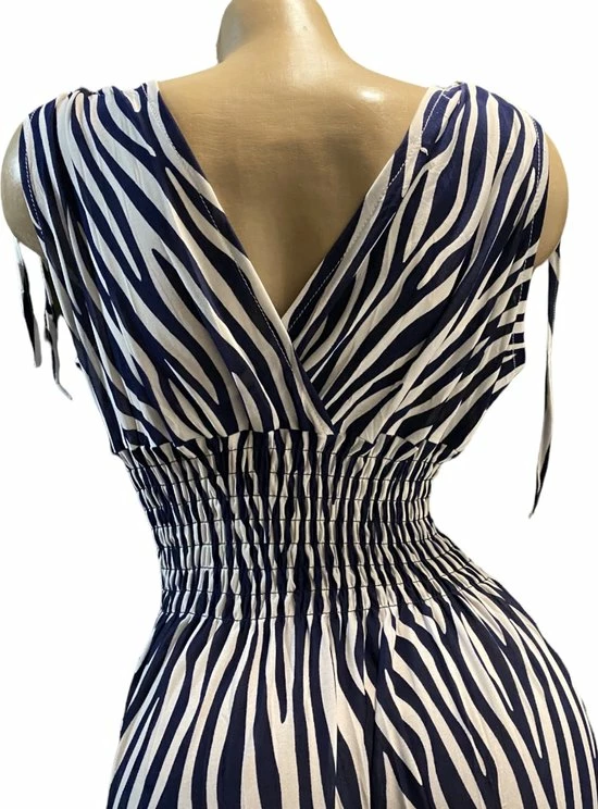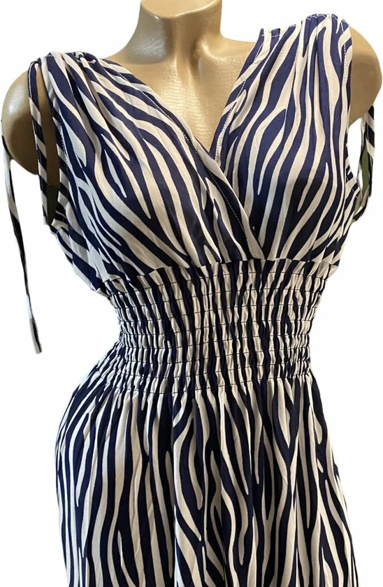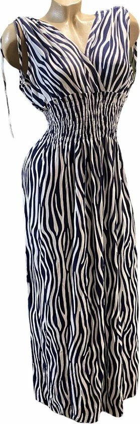 Mooi lang jurkje met kleuren wit/donkerblauw in zebraprint. De jurk heeft een v hals aan de voorkant en v aan de rugzijde. De jurk heeft aantrektouwtje op de schouders en de taille is getailleerd. Het jurkje draagt comfortabel en valt soepel. In de taille zit soepele elastiek waardoor de jurk door meerdere maten kan worden gedragen. Het materiaal is fijne en gladde stof van 100% viscose. De lengte van de jurk is circa 140cm lang. Wasbaar op 40 graden.